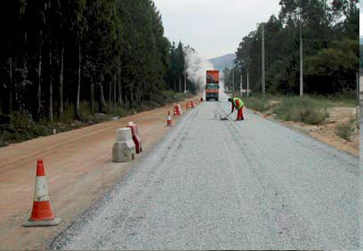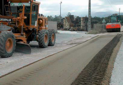 El suelo cemento se consiguió mediante la técnica de reciclaje de fi rmes con cemento por vía húmeda en las zonas en que el nuevo trazado se superpone al existente, y mediante un reciclaje de material de aportación en las nuevas variantes.