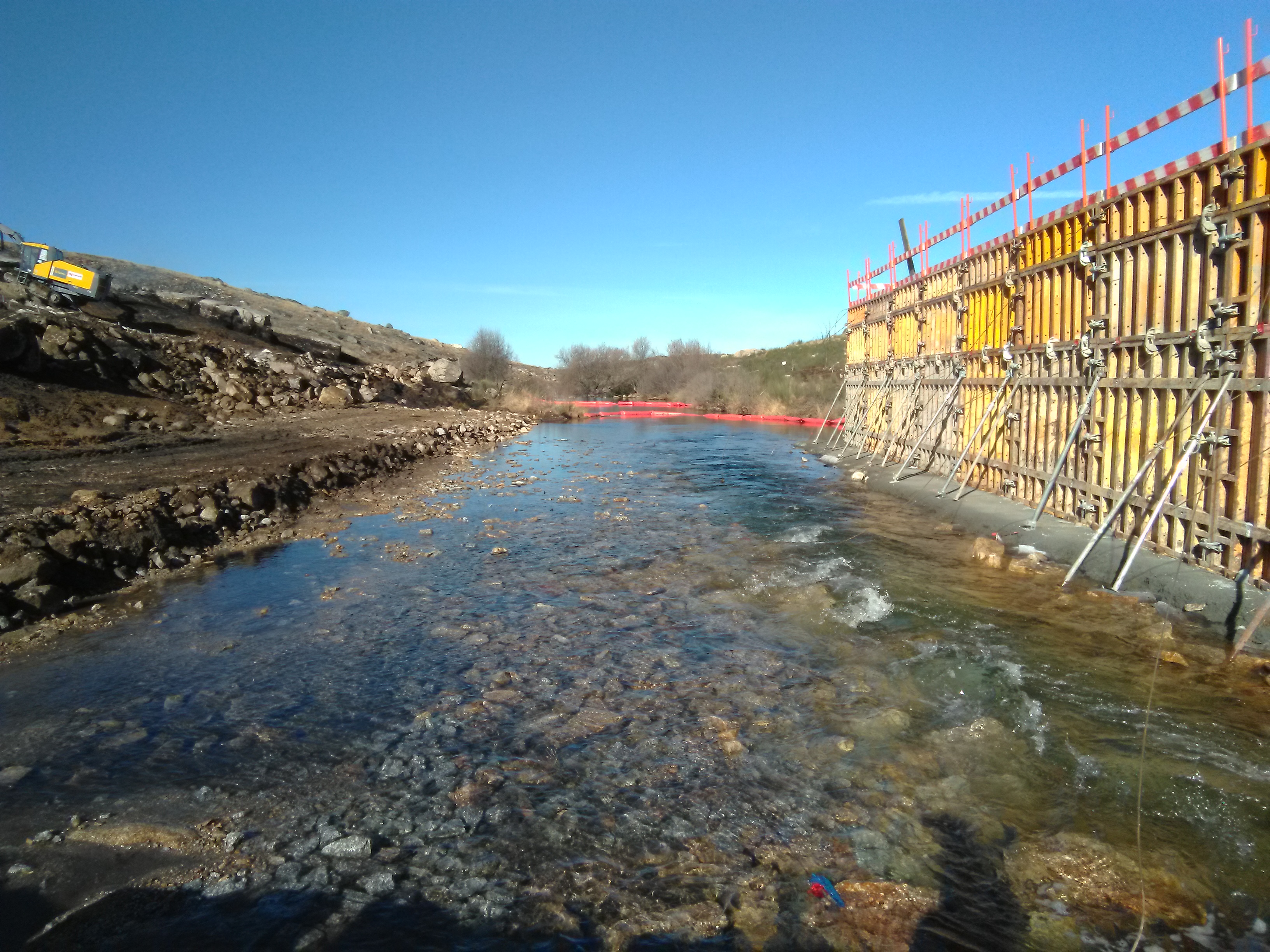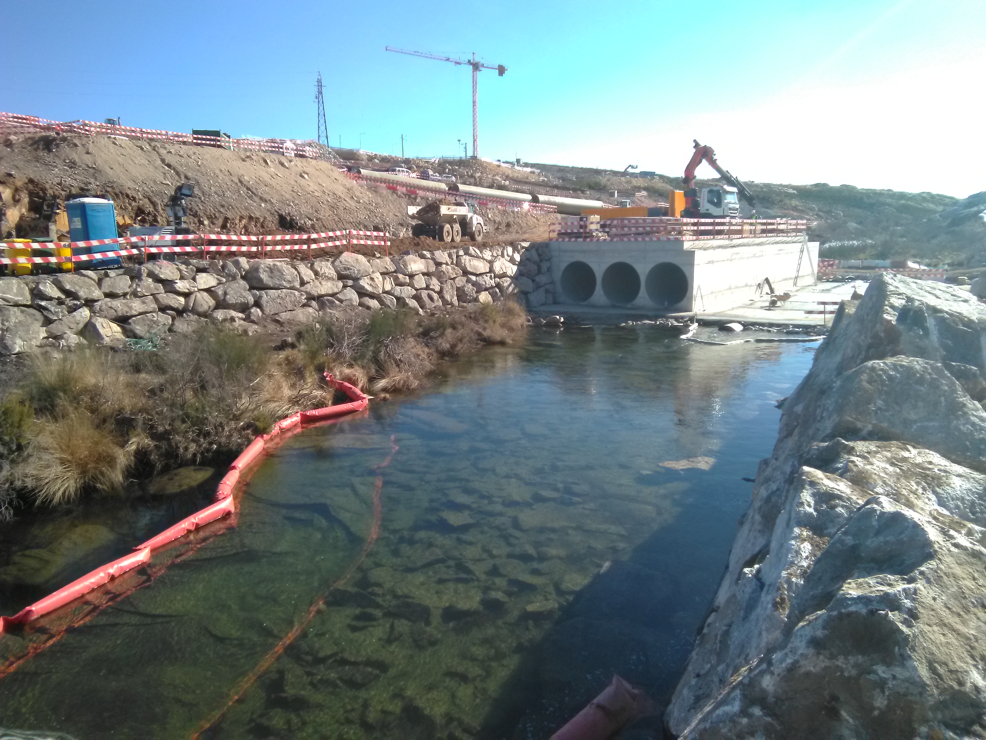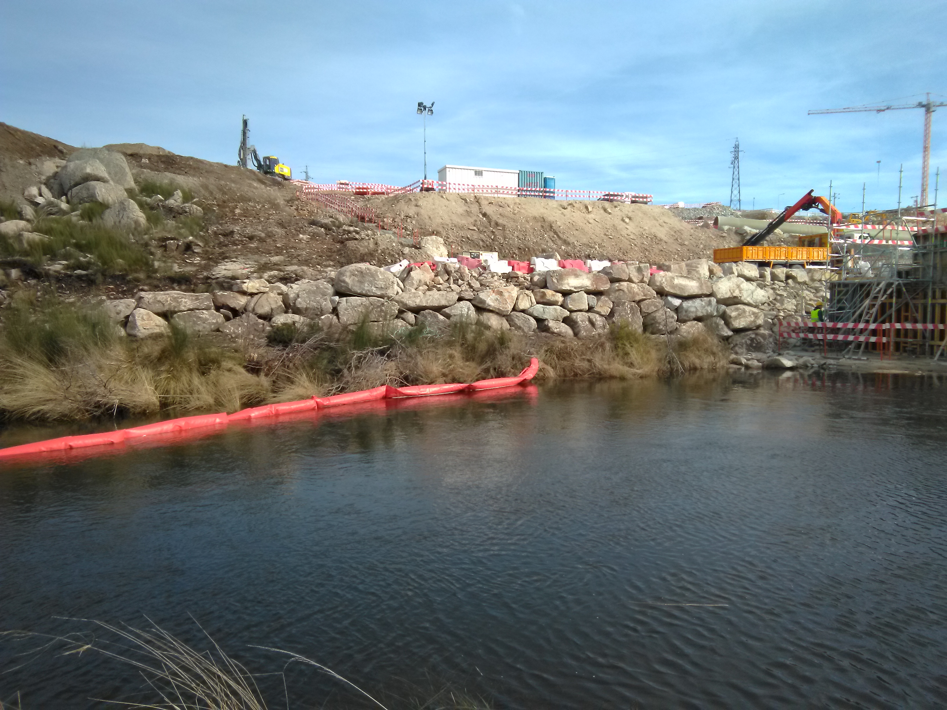 Las actividades de excavación en los márgenes y el lecho del río Torno, así como el levantamiento del terraplén generaron mucha turbidez en el agua por la elevada cantidad de sólidos en suspensión, hasta tal punto que los operarios tenían que parar su actividad periódicamente para que se aclarara la corriente.
