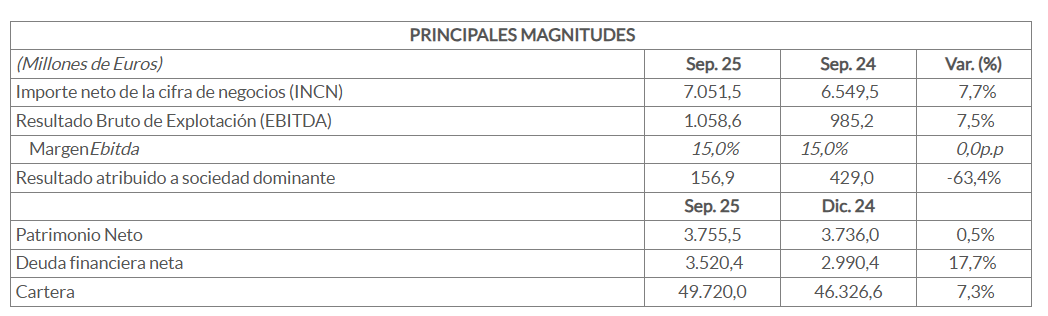 El Grupo FCC ha registrado un importe de la cifra de negocios de 7.051,5 millones de euros en los nueve primeros meses del año, lo que representa un 7,7% más respecto al cierre del mismo periodo del año anterior, este resultado se obtiene gracias a la combinación equilibrada tanto de las adquisiciones realizadas por el área de Medio Ambiente durante el ejercicio 2024 en Reino Unido, EE. UU. y Francia, así como al crecimiento orgánico registrado en todas las áreas de negocio, destaca especialmente Concesiones, que ha experimentado un avance del 38%, impulsado por la puesta en marcha de nuevos contratos. Le sigue el área de Agua, que también ha mostrado progresos significativos en sus distintas líneas de actividad.