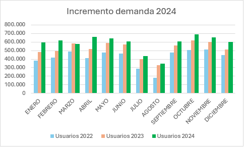 El crecimiento más significativo se produjo entre 2022 y 2023, cuando el número de usuarios aumentó en 1.216.799 personas, un crecimiento del 24,06%. Un ritmo que no se detuvo en 2024, cerrando con 739.972 viajeros más que el año anterior.