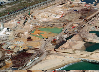 El proyecto contemplaba la excavación de 720.000 m3de tierras, de los cuales 200.000 m3 eran de dragado y excavación bajo nivel freático. Se preveía la utilización de las arenas provenientes de la excavación, para la regeneración de las playas colindantes al puerto, pero la aparición de una mayor cantidad de suelos contaminados, redujo a 85.000 m3el volumen de tierras reutilizado