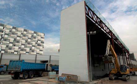 Debido a que la obra se estaba realizando en zona urbana y considerando los niveles de ruido emitidos, se decidió construir una nave de estructura metálica de 60 x 10 m y cerramiento con paneles antisonoros, con el objetivo de reducir el impacto acústico de la cinta transportadora del material y de la maquinaria auxiliar. También se realizó una cubierta antisonora de 4.000 m2 para cubrir el pozo de cruce de las tuneladoras en la zona de La Sagrera.