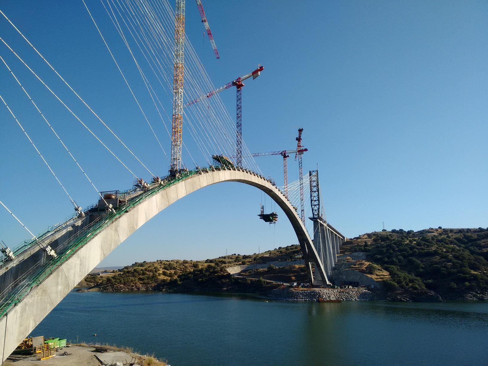 Con el descenso de los carros del margen Norte del arco del viaducto del Almonte se dan por concluidos todos los trabajos relacionados con la ejecución del arco por avance en voladizo, siendo el primer momento en que puede observarse todo el arco cerrado sin los carros de avance.
