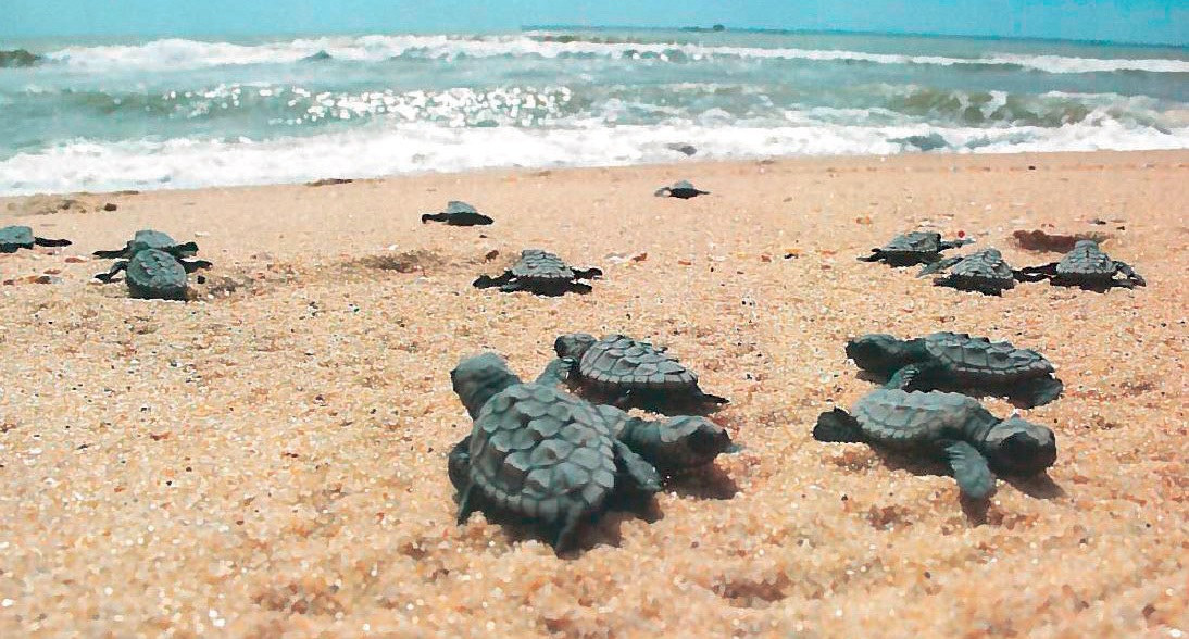 Crías de tortuga abandonando el nido e iniciando su recorrido hacia el mar.