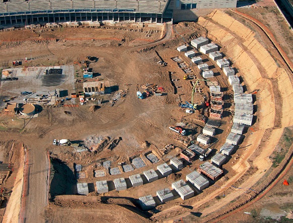 Con el objetivo de reutilizar las tierras sobrantes de excavación y con la previsión de que las tierras del vaciado fuesen de buena calidad, al encontrarse la obra ubicada en una antigua mina de sepiolita restaurada con material de la propia explotación, la obra decidió comenzar a acopiar las tierras procedentes del movimiento de tierras en la zona destinada para el futuro aparcamiento del Estadio.