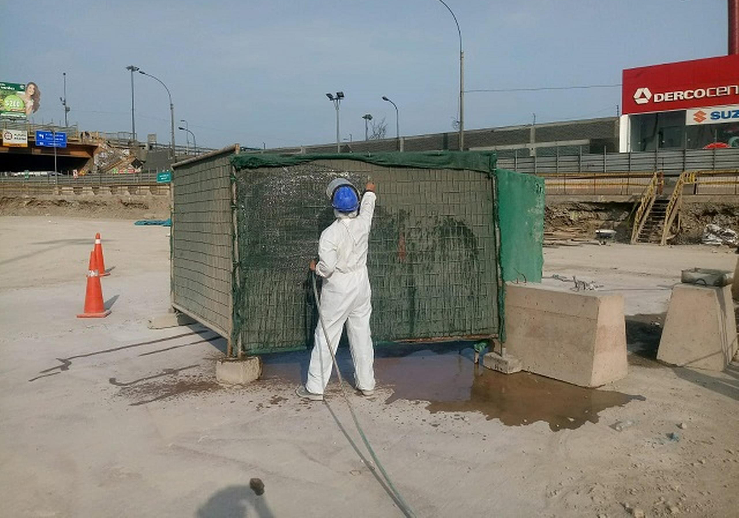 Para evitar que el polvo generado en el corte del hormigón se emita a la atmósfera, se diseñaron recintos cerrados con malla raschel humedecida, orientados según la dirección del viento, con el objetivo de impedir la dispersión de las partículas y, por tanto, reducir el impacto sobre la calidad del aire.